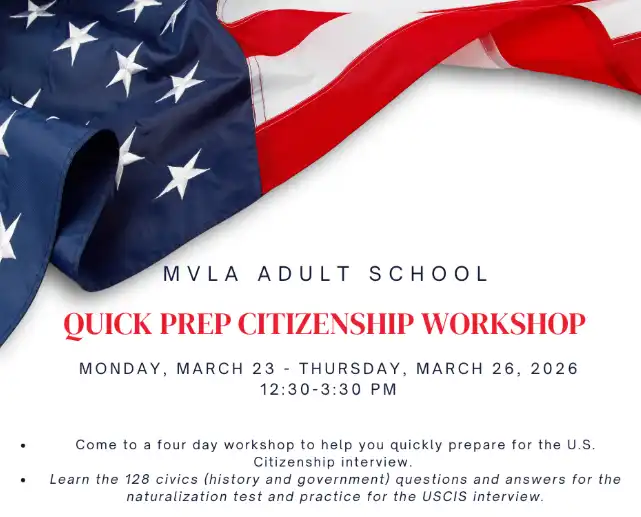 Students interested in signing up for any Citizenship class or workshop can contact mvlaeslprogram@gmail.com or 650-940-1333. New students are welcome to start any time and students can take more than one course as desired.